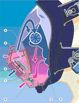Der Mitteldruck wird über eine Leitung zum Lungenautomaten geführt. Dieser Lungenautomat reduziert den Mitteldruck auf einen atembaren Niederdruck (mbar-Bereich) und gibt diesen nur ab, wenn der Geräteträger einatmet. Bei der Feuerwehr Bad Dürkheim haben wir sogenannte Überdruckgeräte. Diese Lungenautomaten erzeugen einen ständigen Überdruck in der Maske so das garantiert wird, das keine Umgebungsluft in die Maske eindringen kann. Dieser Überdruck beträgt ca. 3.5mbar