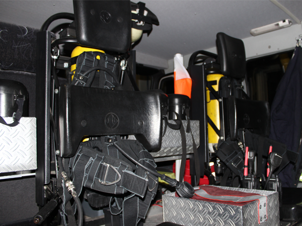 Pressluftatmer sind Atemschutzgeräte die von der Umgebungsluft unabhängig sind. Ein Pressluftatmer besteht aus einem Druckbehälter(Atemluftflasche), einem Druckminderer und einem Lungenautomaten, einem Manometer, einer akustischen Restdruckwarnung dem Tragesystem und der Maske. Das Gewicht eines Pressluftatmers beträgt ca. 16 Kg und die Einsatzzeit beträgt ca. 30 Minuten je nach durchzuführender Arbeit des Geräteträgers. Die Geräte sind in der Mannschaftskabine verlastetet, so das der Atemschutztrupp sich auf der Anfahrt zur Einsatzstelle direkt ausrüsten kann.